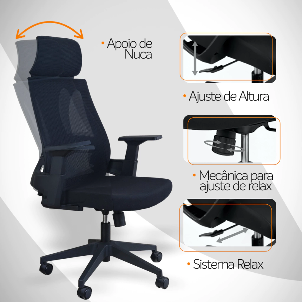 O encosto é revestido em tecido Mesh Premium, composto por 64% de poli elastômero e 36% de poliéster. Já o assento conta com espuma 35D, revestida em tecido 100% poliéster.