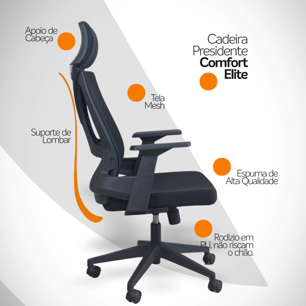 A Comfort Elite combina resistência, funcionalidade e elegância em uma cadeira ideal para home office ou ambientes corporativos.