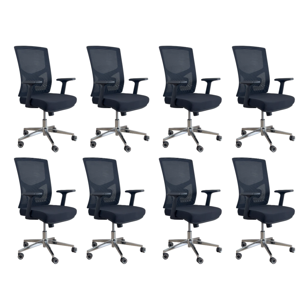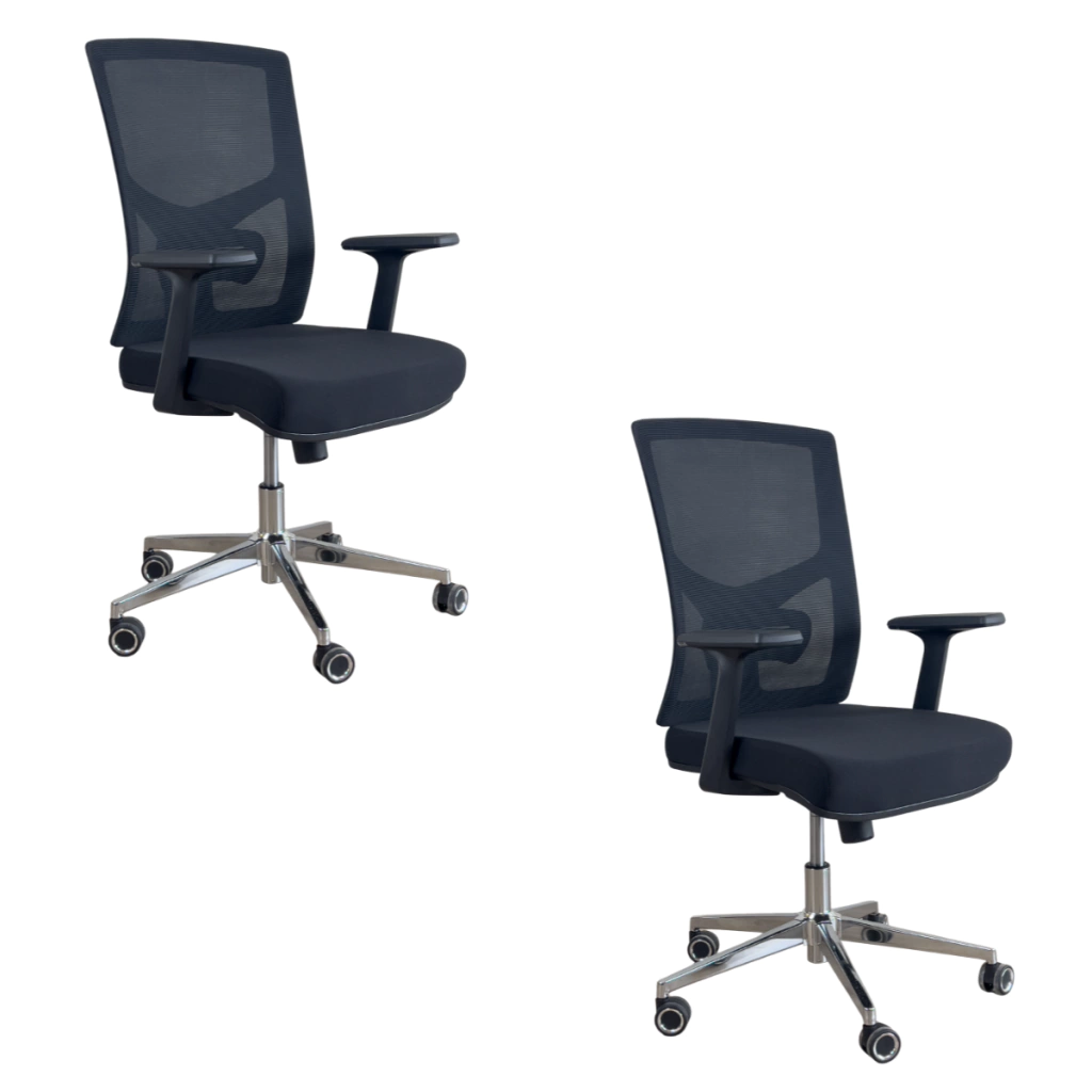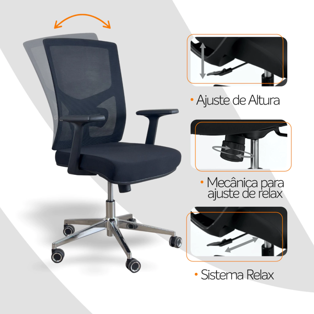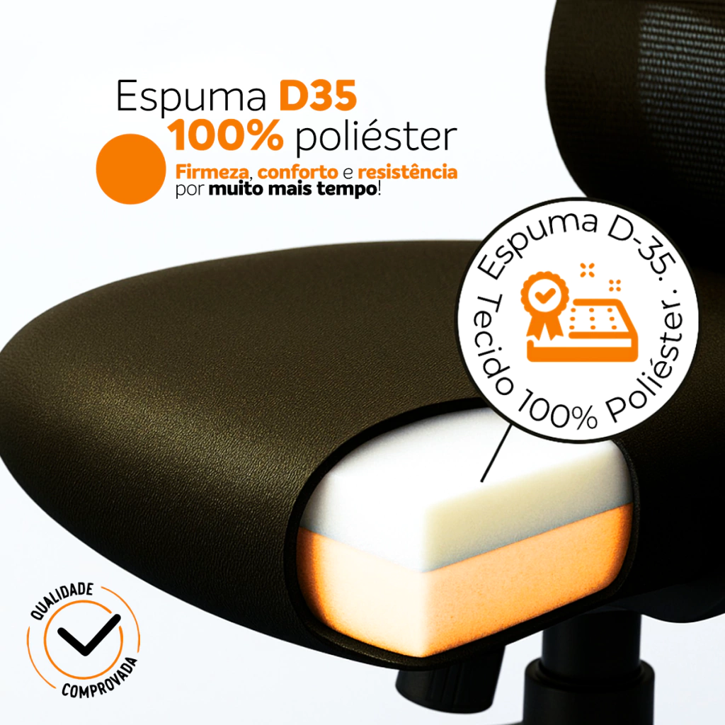 O encosto é revestido em tecido Mesh Premium, composto por 64% de polielastômero e 36% de poliéster. Já o assento conta com espuma 35D, revestida em tecido 100% poliéster.