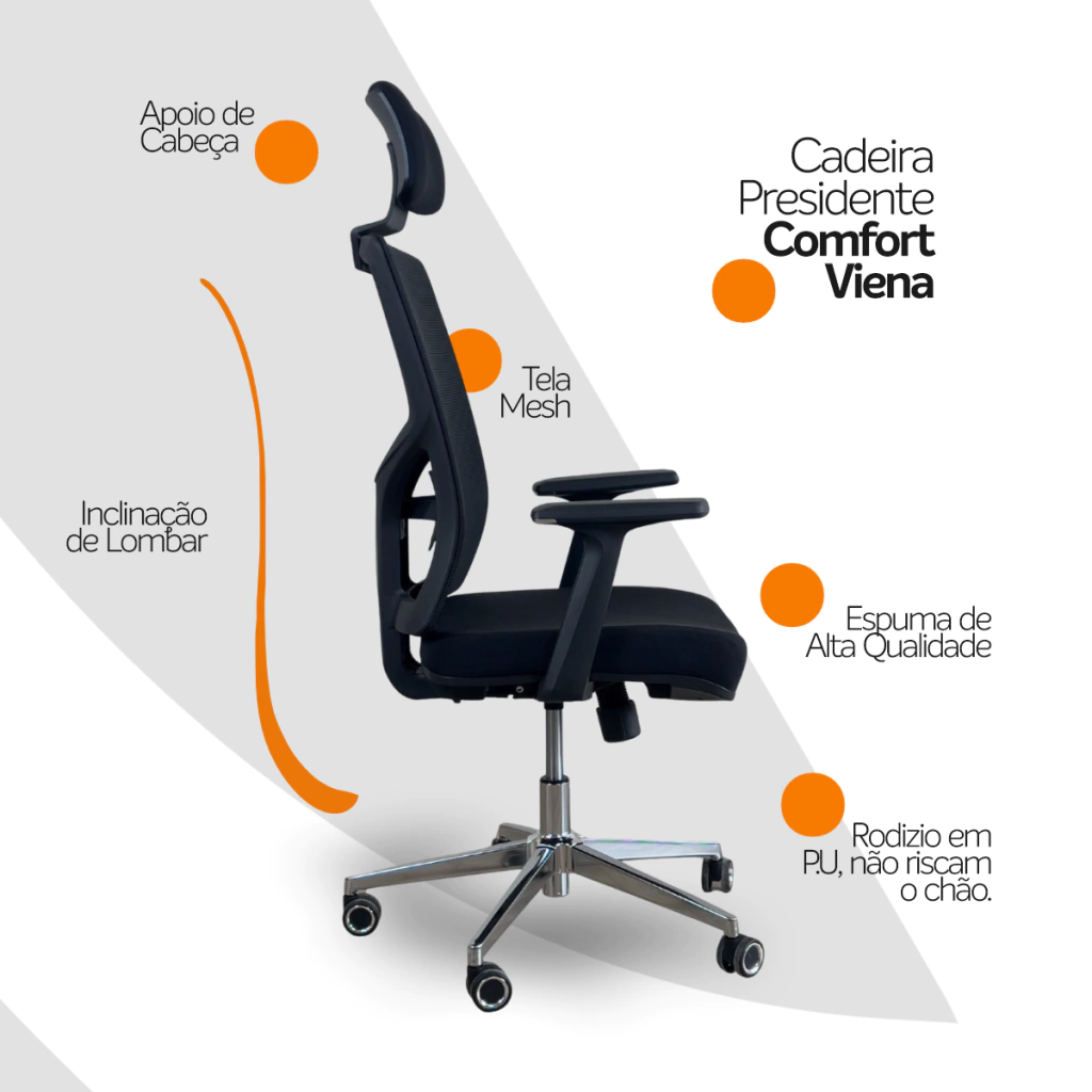 Garanta ergonomia, estilo e desempenho no seu ambiente de trabalho com a Cadeira Presidente Comfort Viena. Projetada para quem passa longas horas sentado, ela combina estrutura robusta com detalhes sofisticados, como apoio de cabeça ajustável e acabamento premium.