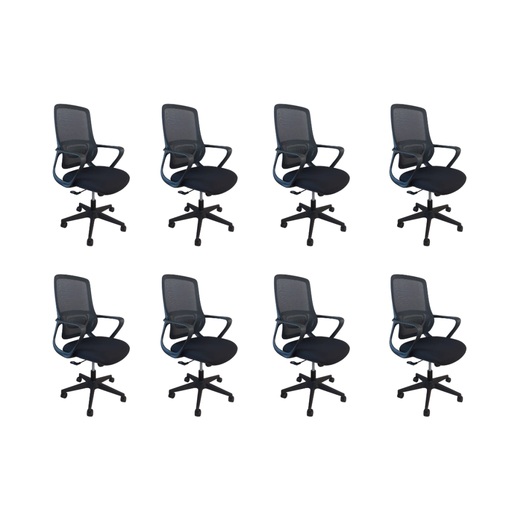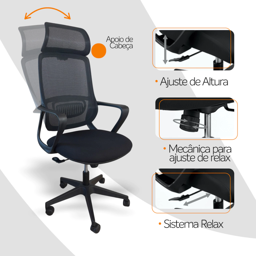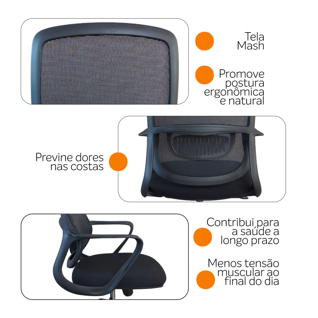 O encosto é revestido em tecido Mesh Premium, composto por 64% de poli elastômero e 36% de poliéster. Já o assento conta com espuma 35D, revestida em tecido 100% poliéster.