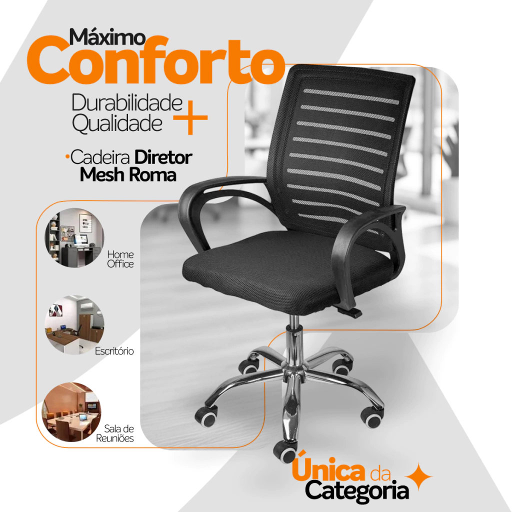 Com a Cadeira de Escritório Secretária Diretor Roma seu conforto está garantido, seu design, ajuste de altura e tela mesh, são a combinação perfeita para longas horas de trabalho no escritório ou home office.