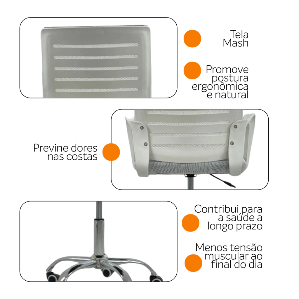 Aproveite ao máximo o ajuste de altura desta cadeira. Isso lhe permitirá adaptar a posição do seu tronco em relação à mesa, proporcionando um nível de conforto específico para suas necessidades individuais.