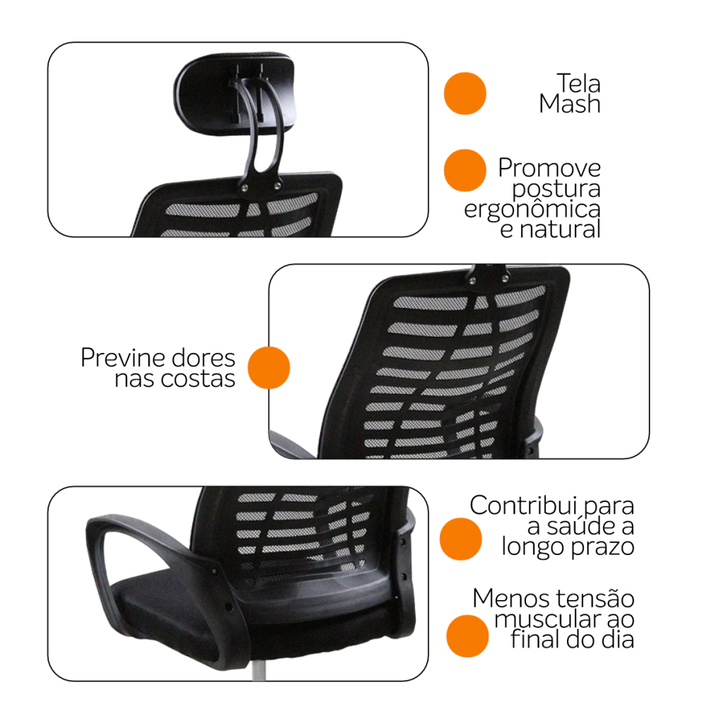 O encosto em tela Mesh respirável mantém a circulação de ar constante, enquanto o assento em madeira multilaminada com acabamento em nylon de alta qualidade assegura durabilidade e conforto.